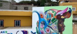 - Características: Mural expuesto en la fachada exterior del polideportivo. Se observa el estilo del autor y el uso de colores en contraste y armonía a la vez. Destaca las figuras infantiles realizando diferentes acciones deportivas y de juego en movimiento, representando así el uso específico que se le da al lugar